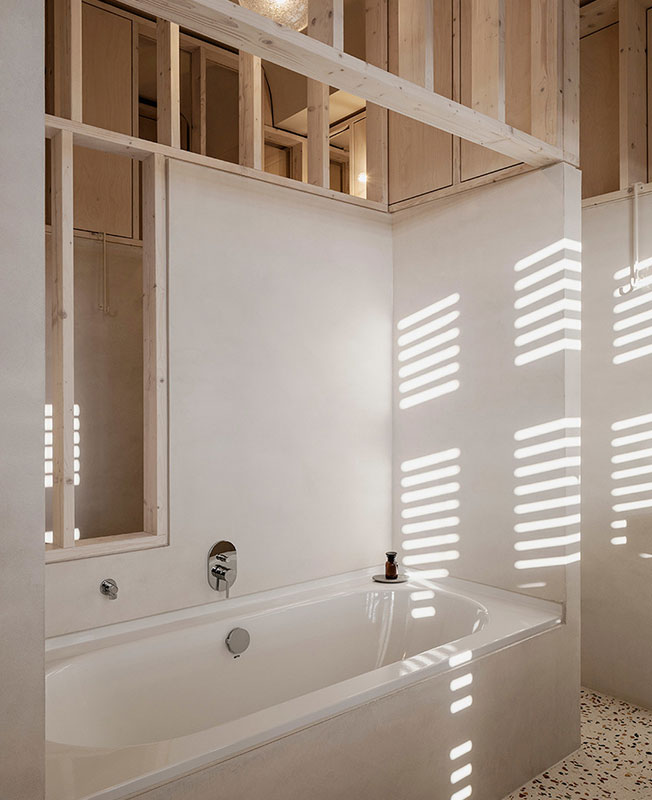 Гипсовые стены были соединены с полами грибного оттенка, а также с песочно-бежевыми шторами и покрывалами. Каркасы кроватей, стеллажи и боковые столы изготовлены из светлой фанеры Panerholz , которая выделяет природные смолы во время производственного процесса, придавая поверхности слегка изношенный внешний вид.