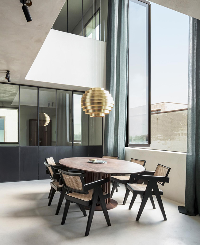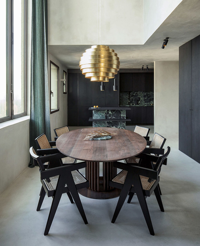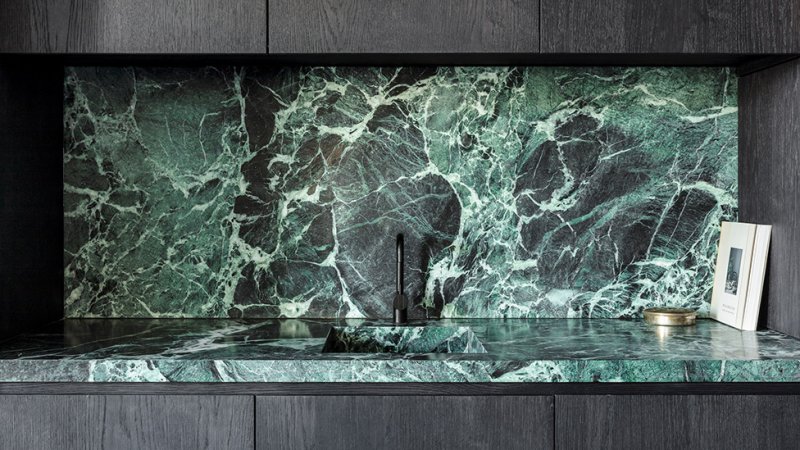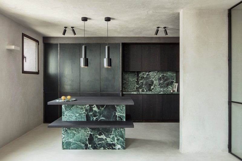 Архитектор придерживался натуральной палитры и проверенных временем черненного металла, темного ореха и мрамора выразительного зеленого оттенка. Шпон темного дуба использовался для создания кухонной мебели.