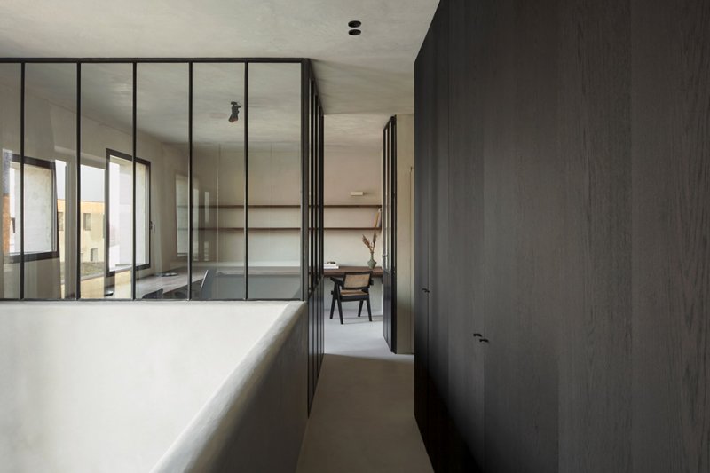 Бельгийский архитектор Арьяан де Фейтер спроектировал офис для голландской адвокатской фирмы Deknudt Nelis внутри одной из башен комплекса Kanaal недалеко от Антверпена. Офис расположен в одном из четырех многофункциональных зданий под названием Cubes, которые занимают недавно перестроенный солодовенный завод. Kanaal стоит на берегу Альберт-канала. Пустующие здесь здания промышленной архитектуры двадцать лет назад начал выкупать Аксель Вервордт. По его словам, девелопером его сделал антикварный бизнес, который требует много места. На месте фабричных цехов и башен компания Вервордта создала целый кластер Kanaal с 30 офисами, мастерскими, выставочным пространством и жильем на 100 квартир. Юристы компании, которая имеет также офисы в Брюсселе и Куртре, попросили, чтобы их третий офис вызывал чувство «подлинности и честности», напоминая клиентам о высоком профессионализме их адвокатской фирмы. Они хотели, чтобы рабочее пространство имело ту же эстетику, что и собственная студия де Фейтера, расположенная неподалеку. Архитектор придерживался натуральной палитры и проверенных временем черненного металла, темного ореха и мрамора выразительного зеленого оттенка. Шпон темного дуба использовался для создания кухонной мебели. «Атмосфера была чрезвычайно важна— мы искали материалы, которые излучают тепло, уверенность и единство, а также решительность и профессионализм», — Арьян де Фейтер. — Мы быстро пришли к идее чистых материалов, таких как сталь, камень и дерево». Арьян де Фейтер окончил Антверпенский институт Henry Van de Velde в 1999 году. Практически сразу после этого он создал собственное дизайнерское бюро. С 2006 года он также занимает преподавательскую должность на факультете архитектуры Университета Антверпена. Работа студии характеризуется любовью к чистоте, использованием честных материалов и сильным чувством детализации. Акцент делается на тихом минималистичном дизайне, лишенном всего ненужного без ущерба для функциональности и комфорта. В этом история и личность клиента имеют первостепенное значение. Открыв свою мастрскую в 2016 году в комплексе Акселя Вервордта Kanaal Де Фейтер завершил здесь 5 проектов, начиная от частных квартир заканчивая конторами.