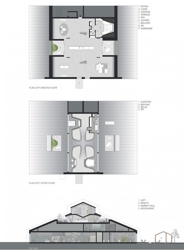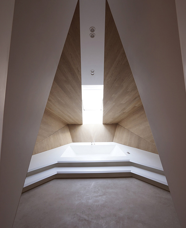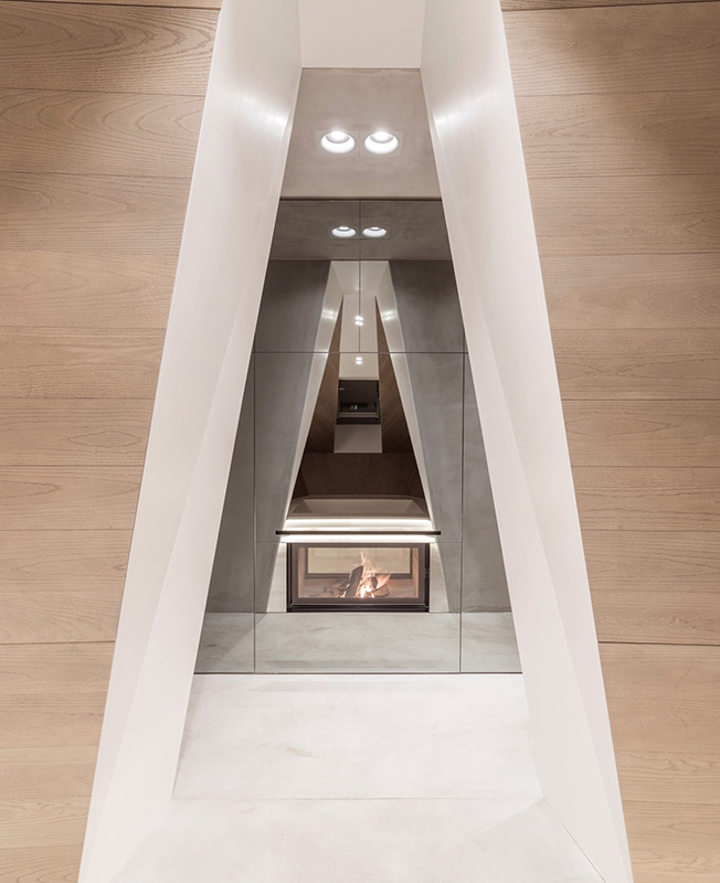 Проект Smartvoll Architects в историческом районе Зальцбурга Панцерхалле мог бы предназначаться Джеймсу Бонду. Бывший чердак превращен в двухуровневое пространство с величественной широкой Т-образной лестницей, открытой спальней, камином и душем на балконе за прозрачной стеной. Проект был удостоен нескольких дизайнерских премий. Многослойный, текстурированный и элегантный лофт занимает площадь 350 кв. метров. Он одновременно скульптурный и прагматичный, не говоря уже о планировке, которая менее всего соответствует обычным нормам. Гладкий и вощеный бетон является одним из решающих материалов для придания выразительной формы всему пространству. Эпицентром нижнего этажа стала открытая семиметровая островная кухня. Спальни, ванные комнаты распределены по всему пространству, как отдельные тела. Постель изолирована лишь легкой занавеской. Обнаженная стеклянная душевая кабина выступает из полностью застекленного блока на высоте пяти метров. Абсолютной интригой интерьера, хотя и скрытой, является спа-центр.
