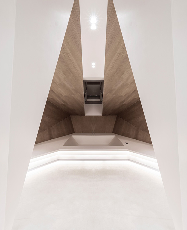 Эпицентром нижнего этажа стала открытая семиметровая островная кухня. Спальни, ванные комнаты распределены по всему пространству, как отдельные тела. Постель изолирована лишь легкой занавеской. Обнаженная стеклянная душевая кабина выступает из полностью застекленного блока на высоте пяти метров. Абсолютной интригой интерьера, хотя и скрытой, является спа-центр.
