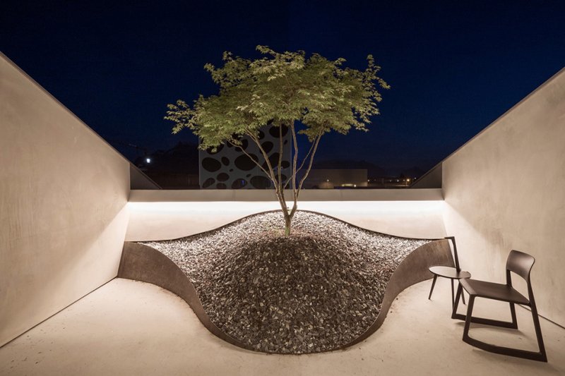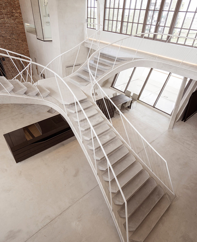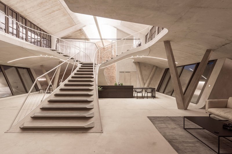 Многослойный, текстурированный и элегантный лофт занимает площадь 350 кв. метров. Он одновременно скульптурный и прагматичный, не говоря уже о планировке, которая менее всего соответствует обычным нормам. Гладкий и вощеный бетон является одним из решающих материалов для придания выразительной формы всему пространству.