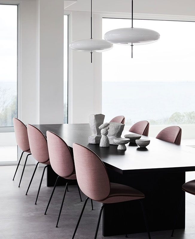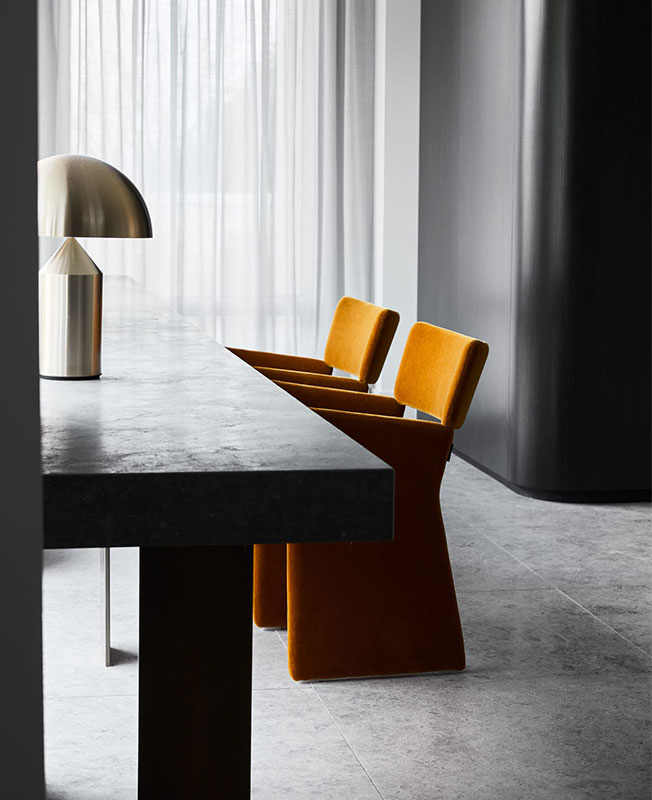 Весь дом — одно большое упражнение в роскоши. Высококачественная мебель большого размера соответствует высоким потолкам. Для гостиной был выбран большой диван дизайна Пьеро Лиссони от Living Divani, четырехметровый обеденный стол был сделан на заказ. Светильники Flos в спальнях подсвечивают фактурное постельное белье, создавая мягкость, которая уравновешивает огромное пространство.