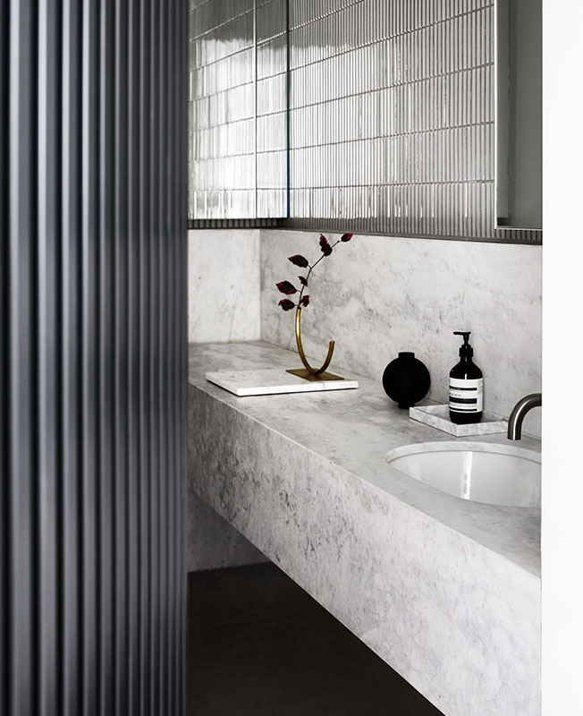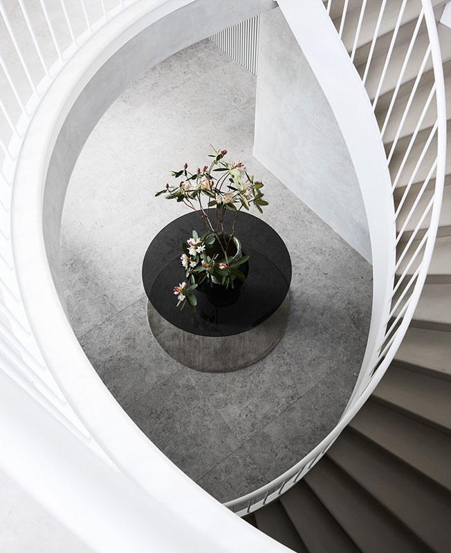 Прихожая залита естественным светом. Фактурные бетонные стены подчеркивают изогнутую форму лестницы. А тонкая металлическая отделка компенсирует богатую патину и рисунок натуральных материалов, таких как камень и дерево. Участки из серого мрамора в жилых комнатах, на кухне и в ванных добавляют великолепия и вдумчивой прочности образу.