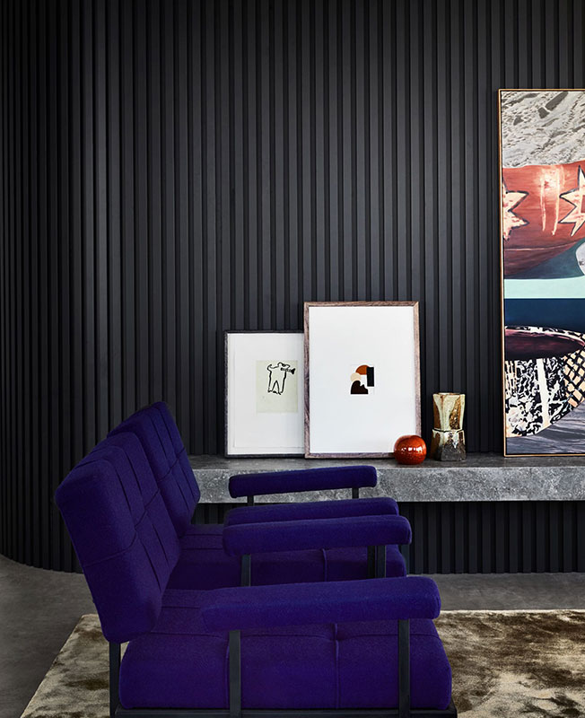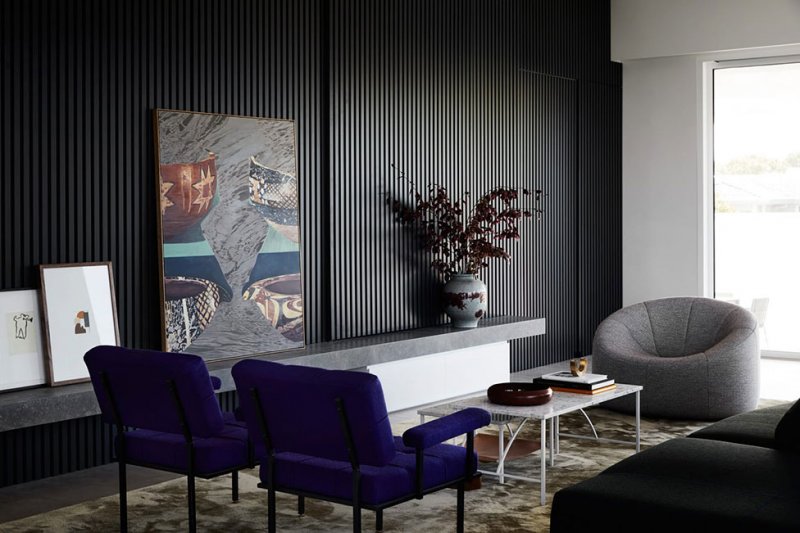 Борясь с огромными размерами дома, дизайнеры Golden сделали акцент на различных настроениях, используя тональные контрасты для разграничения зон. В одном из жилых помещений темные деревянные панели скрывают телевизор, чтобы сохранить единый вид стены.