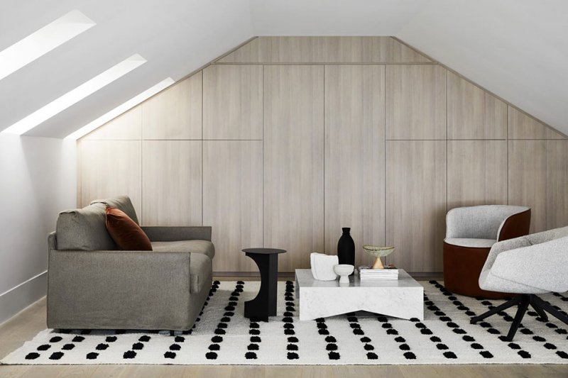 В другой гостиной можно заметить светлую древесину и мансардные окна — воздушную альтернативу более темным комнатам. Полы, отделанные плиткой, создают синергию между открытой террасой и основными внутренними комнатами.