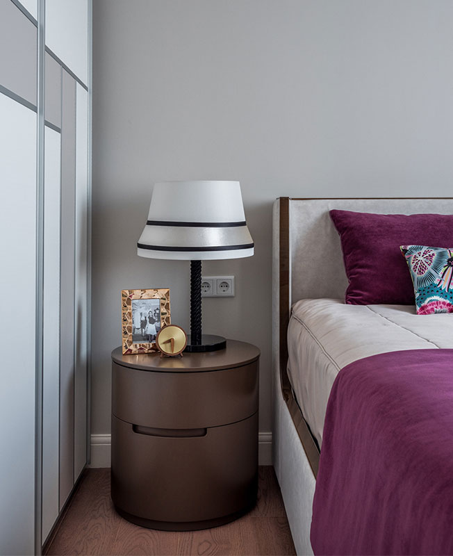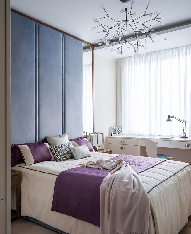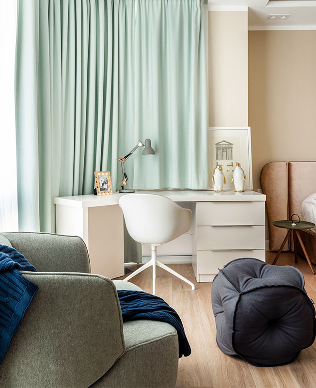 Также необходимо было добиться разнообразия в оформлении трех детских спален при сохранении единой стилистики квартиры. Для каждой комнаты был выбран акцентный цвет. Например, младшая дочка любит цвет свежей мяты — он разнообразил сдержанную палитру ее спальни.