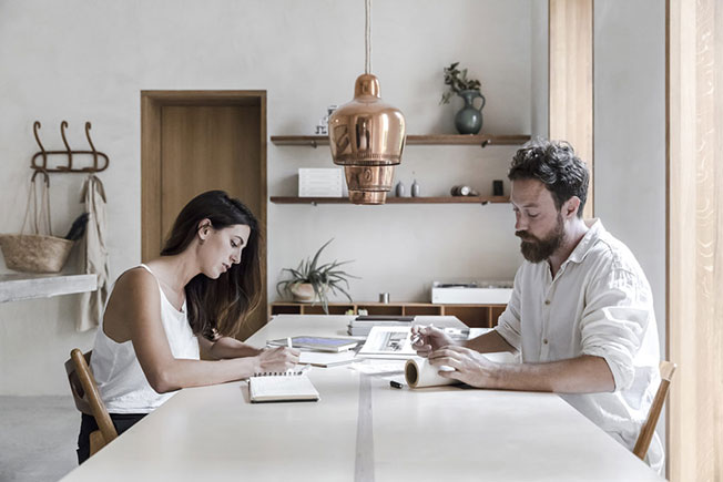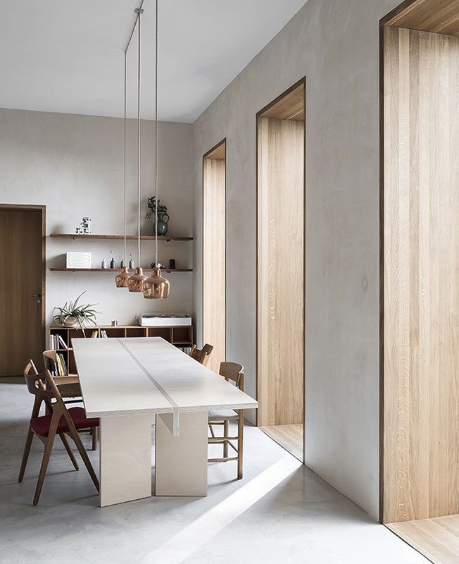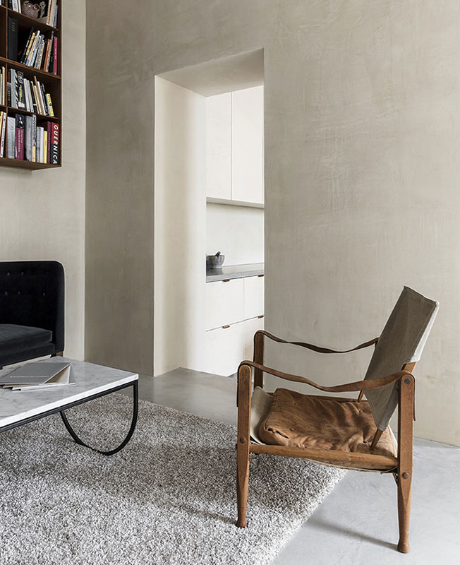 Интерьер, который создали Mar Plus Ask, проявляет средиземноморские и скандинавские влияния в виде гладко отштукатурных стен, трехметровыми дубовыми оконными рамами и сделанной на заказ мебелью, включая обеденный стол из деревянных бревен.