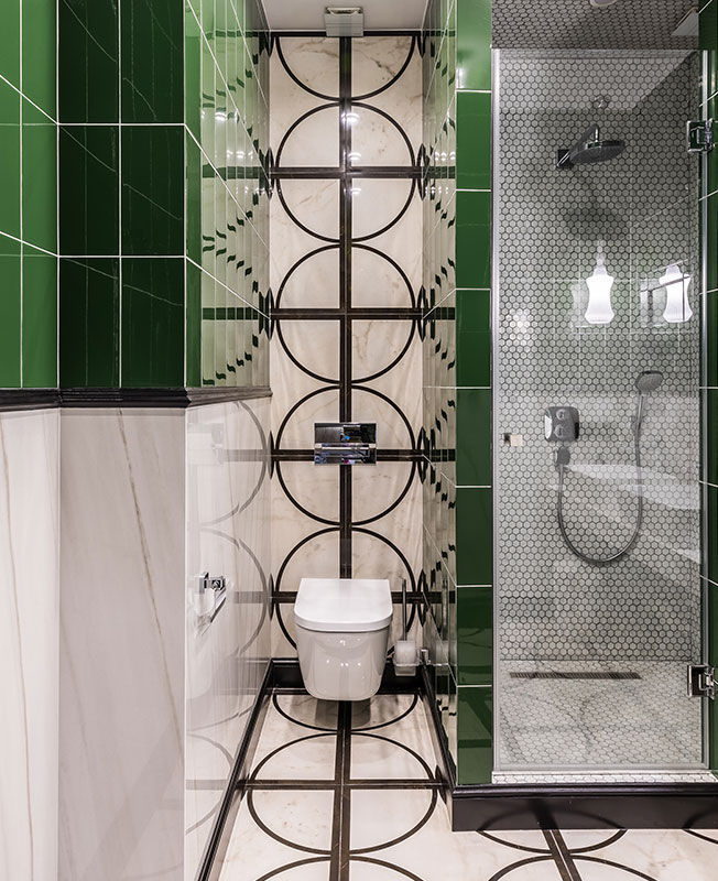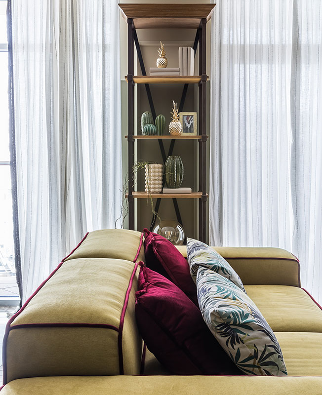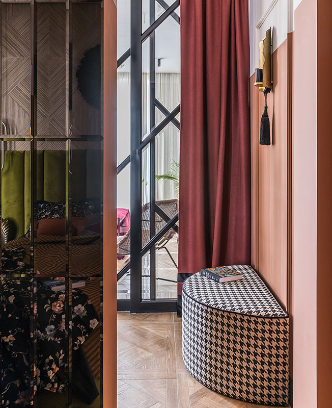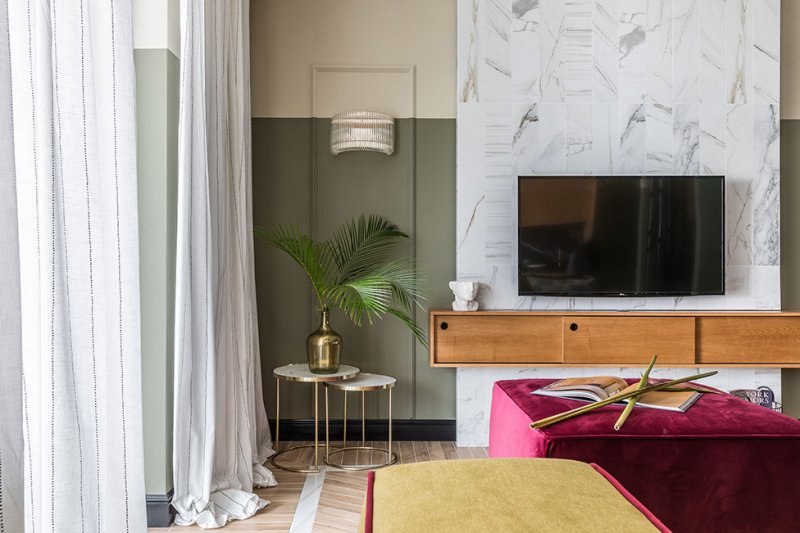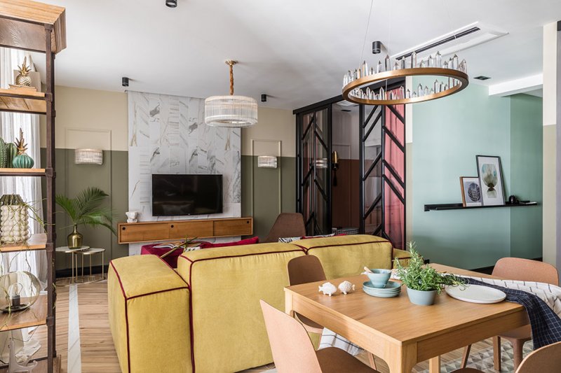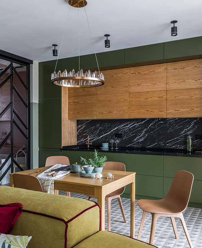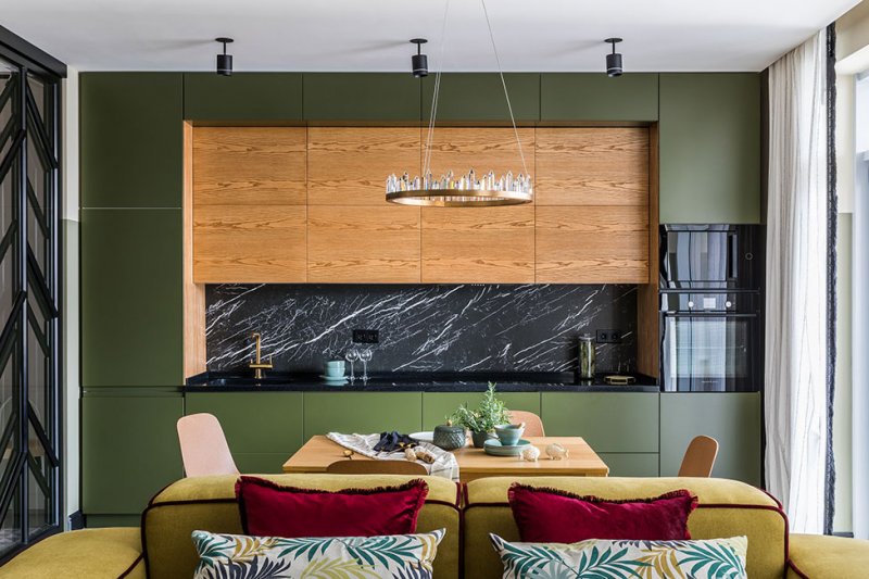 Дизайнер Богема Ардзинба оформила квартиру в Геленджике для временного проживания. Главным достоинством пространства стали панорамные окна с выходом на большой балкон, а вот процесс демонтажа приподнес неприятные сюрпризы — трапециевидную форму стен и несущую колонну в одном из помещений. Необходимо было создать уютное современное пространство для большой семьи из пяти человек. Заказчики хотели получить отличный от их постоянной квартиры интерьер, который в свою очередь оформлен в сдержанном классическом стиле. Приоритетной задачей было создать грамотную планировку, т.к. естественный свет попадал в квартиру только с одной стороны. Все перегородки от застройщика снесли и выстроили пространство заново, поделив на зоны. Сформировали открытую кухню-гостиную и две спальни. Приватные комнаты отделили от общей зоны перегородками. Несущую колонну в главной спальне оформили зеркальной плиткой. Вспомогательные помещения — коридор, гардеробную и санузел — оборудовали на третьей линии от солнечного света. Основной цвет в интерьере — оттенок лаврового листа с яркими акцентами в виде предметов мебели. Продолжая тему насыщенных красок, дизайнер добавила в главной спальне глубокий терракотовый оттенок. Стены выкрасили в два цвета — прием, визуально расширяющий пространство, поддерживают и горизонтальные молдинги. Дизайнер решила комбинировать не только цвета, но и материалы — интересным решением стали полы из натуральной древесины со вставками из керамической плитки с фактурой под мрамор. Практически все предметы мебели были изготовлены на заказ по эскизам дизайнера. nonehttps://www.instagram.com/bogemaard/nonenone