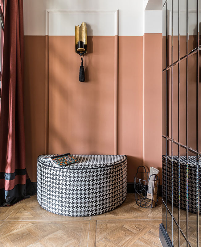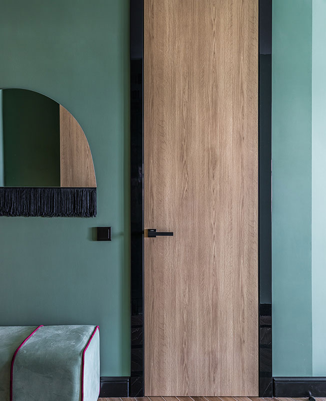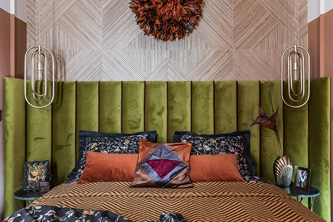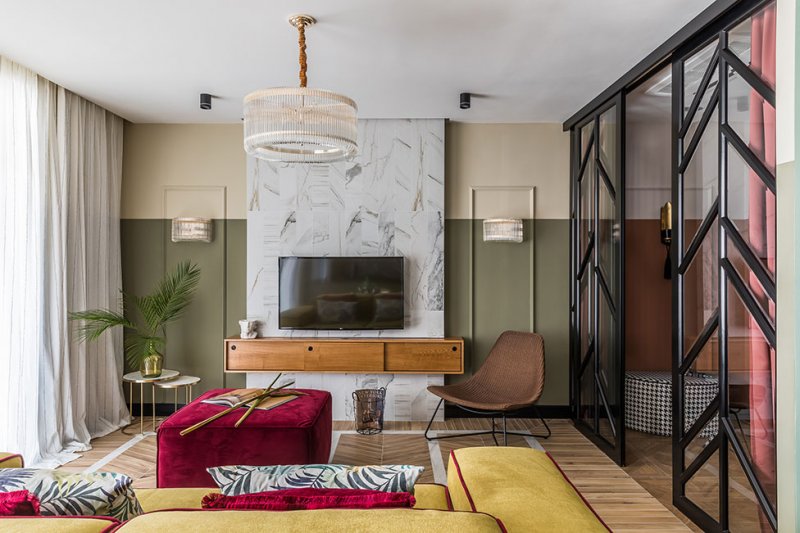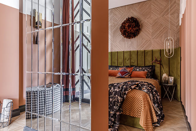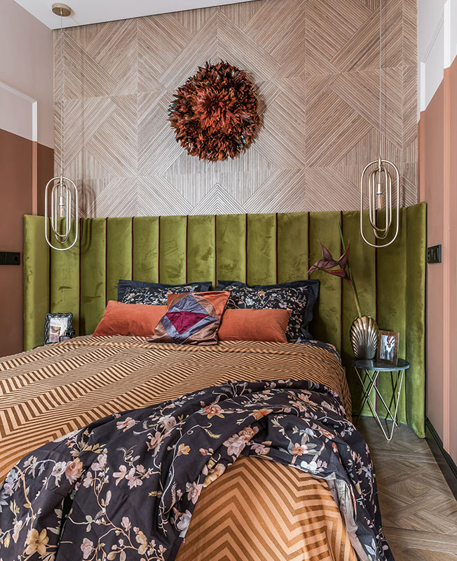 Основной цвет в интерьере — оттенок лаврового листа с яркими акцентами в виде предметов мебели. Продолжая тему насыщенных красок, дизайнер добавила в главной спальне глубокий терракотовый оттенок. Стены выкрасили в два цвета — прием, визуально расширяющий пространство, поддерживают и горизонтальные молдинги.