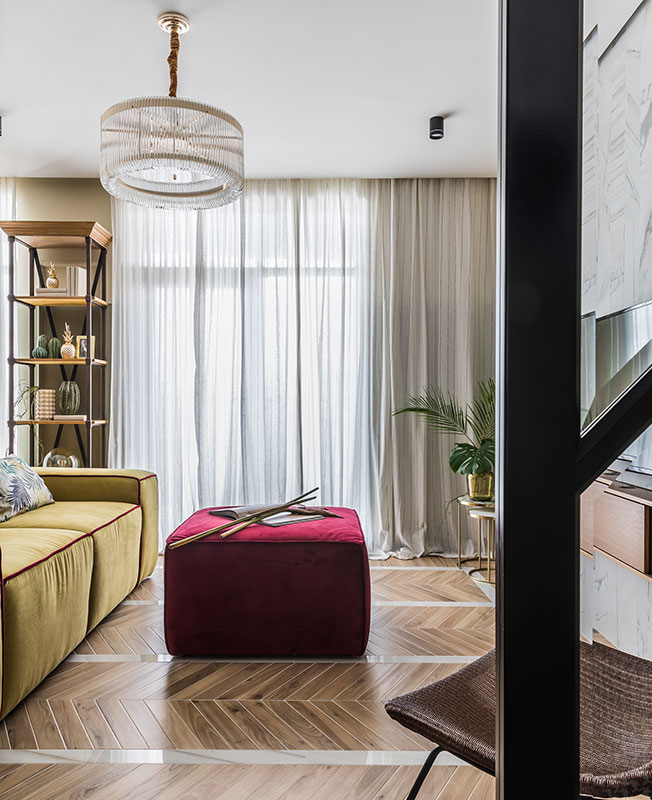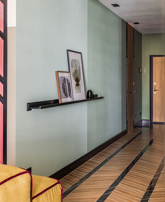 Дизайнер решила комбинировать не только цвета, но и материалы — интересным решением стали полы из натуральной древесины со вставками из керамической плитки с фактурой под мрамор. Практически все предметы мебели были изготовлены на заказ по эскизам дизайнера.