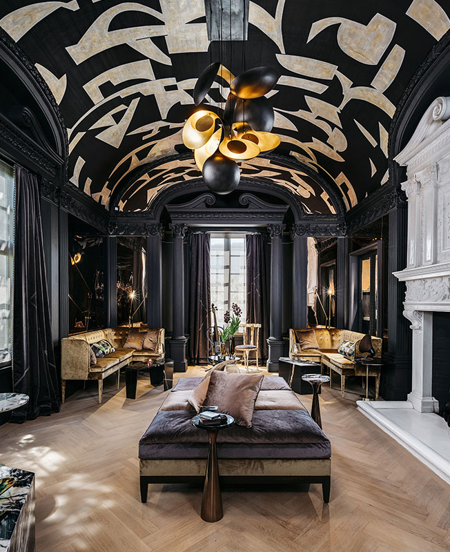 Четыре экспозиции украшают новые коллекции обоев с ручной росписью de Gournay. Проект Symphony Мартина Кобуса, вдохновленный скульптурными формами середины XX-го века, оформлен сводчатым потолком, окленным листами de Gournay. Листы отшлифованы перед нанесением никелированного раствора, который придает эффект перламутрового состаривания, дополнительный тон и патину.