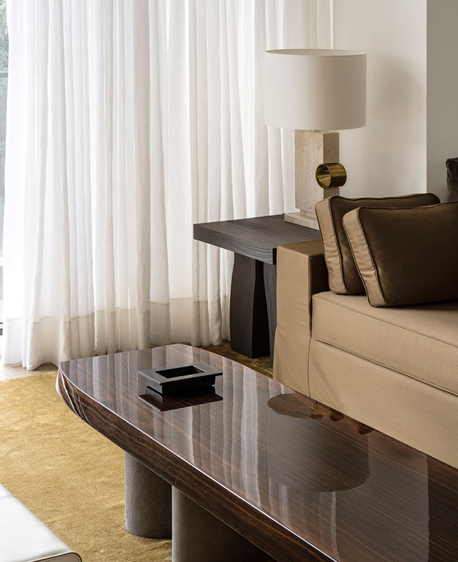 Гостиная. Столик спроектировала Валери Ростень, в качестве материала выбрав полированную древесину палдао. Лампы на основании из травертина и латуни — винтаж 1980-х.