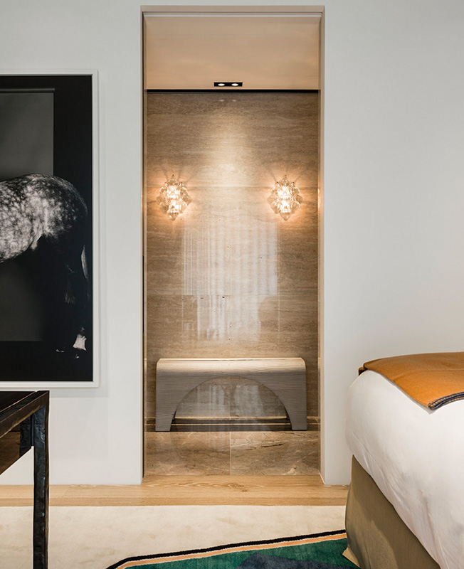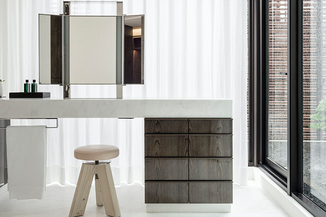 Ванная при главной спальне. Компоненты из белого намибийского мрамора выполнены во Франции, в мастерской Brocatelle. Табурет: кедр.
