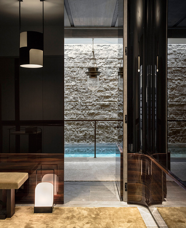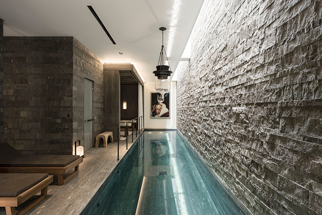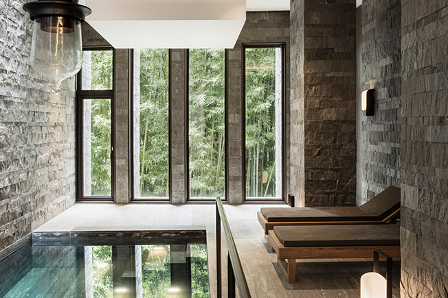 Помещение бассейна отделано камнем швейцарского бренда Val Stone: нарочито грубым, колотым на стенах и гладким, шлифованным на полу. Светильники Caravelle, диз. Кристиан Лиэгр. Через высокие узкие окна виден бамбуковый лес.