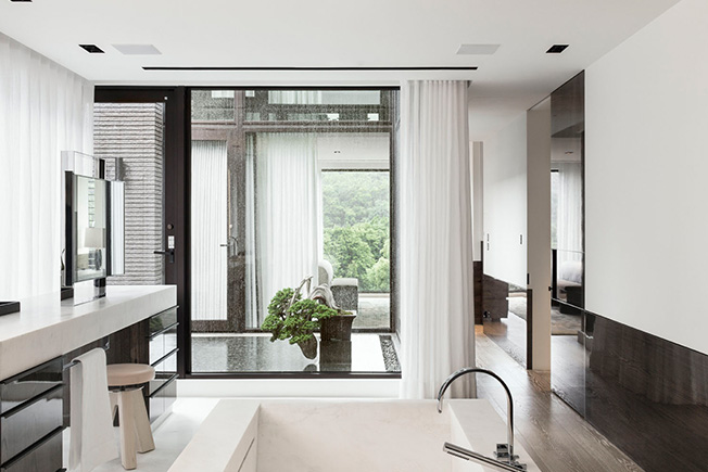 Весь третий уровень дома занимают приватные апартаменты хозяев, они состоят из спальни, ванной и двух гардеробных. Пространство разворачивается вокруг патио, в которое автор проекта поместила 200-летний бонсай.