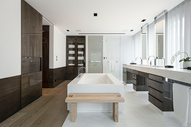 Ванная при главной спальне. Компоненты из белого намибийского мрамора выполнены во Франции, в мастерской Brocatelle.