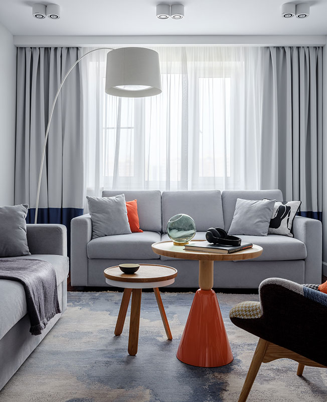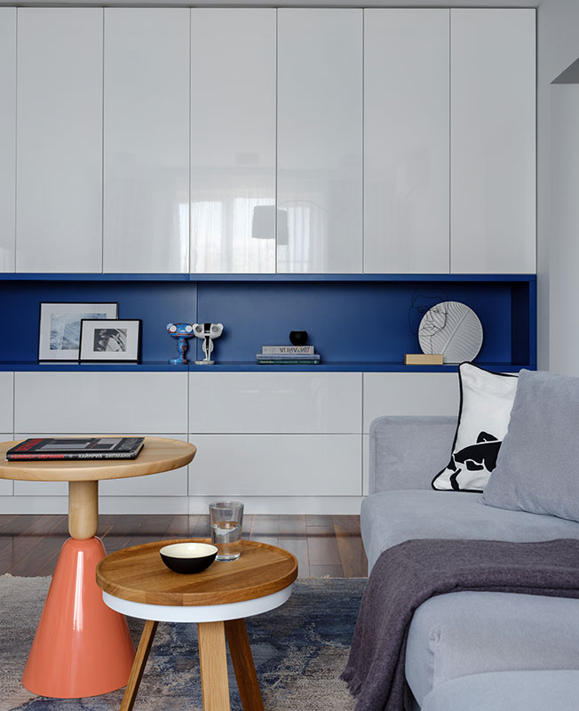 Журнальный столик, Sancal. Ковер, Dovlet House. Текстиль, Happy Collections. Картина, Саша Ким. Дизайнеры Анастасия Туганова, Ярослав Ряжский, Юлия Гуревич (Studio25) оформили квартиру 83 кв. метра в Химках и рассказали о необычном опыте в их практике. Заказчики, пара с двумя детьми, принимали самое активное участие в реализации проекта за всю историю студии. «Владелец увидел в интернете один из наших проектов — интерьер в синих тонах, и обратился к нам за дизайном квартиры в новостройке. Заказчики хотели светлое, современное, функциональное пространство, а концепция строилась вокруг насыщенного синего цвета. Фрагмент гостиной. Кресло, La Forma. Журнальный столик, Sancal. Ковер, Dovlet House. Текстиль, Happy Collections. Напольный светильник, Foscarini. Корпусная мебель выполнена на заказ по эскизам дизайнеров, Мастерская Андреева