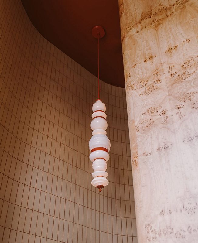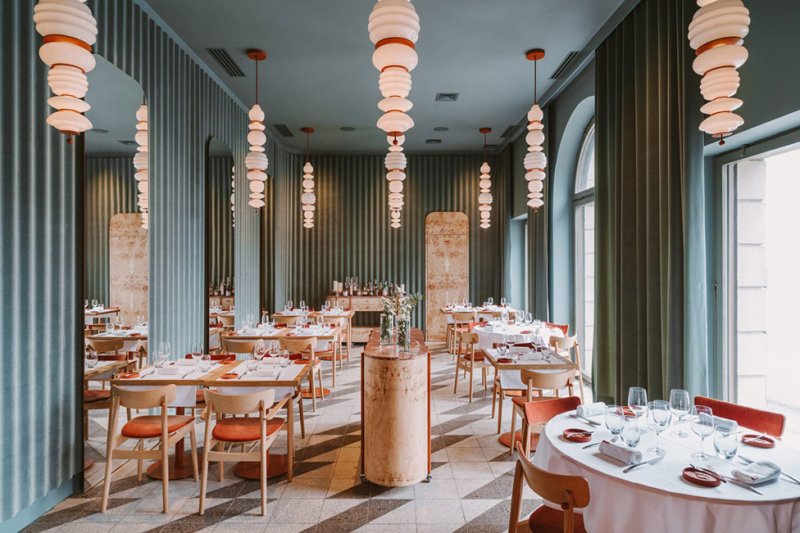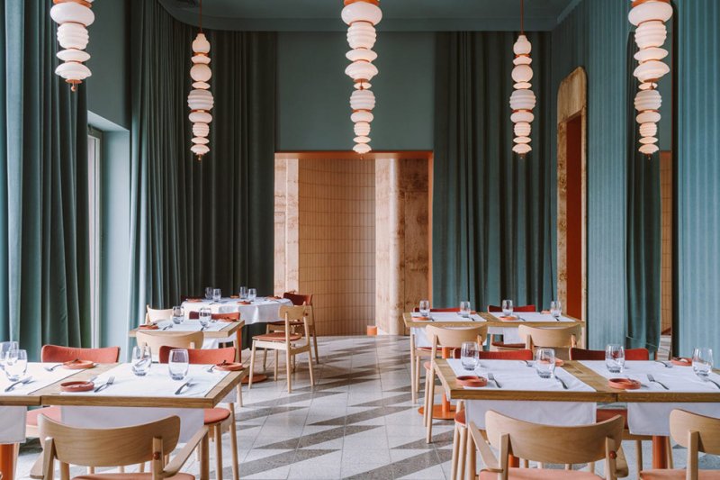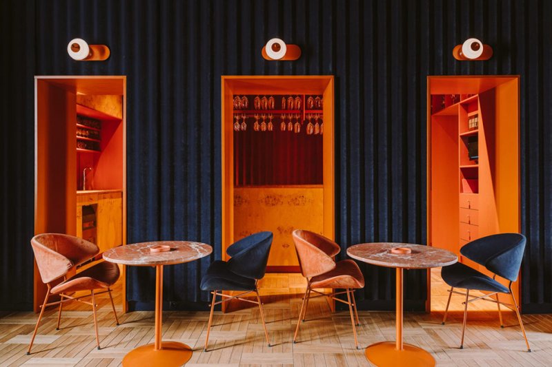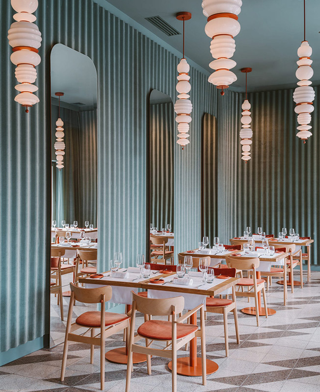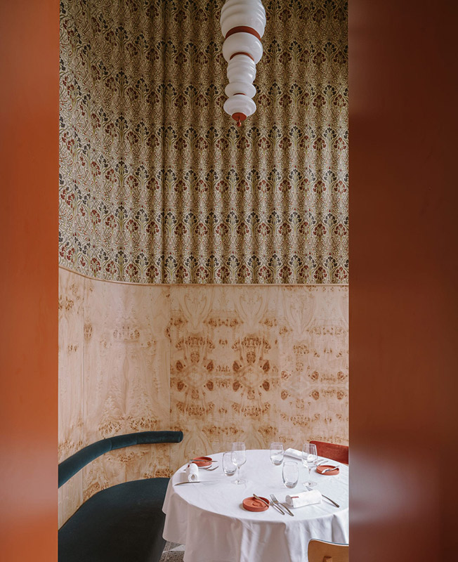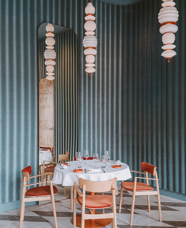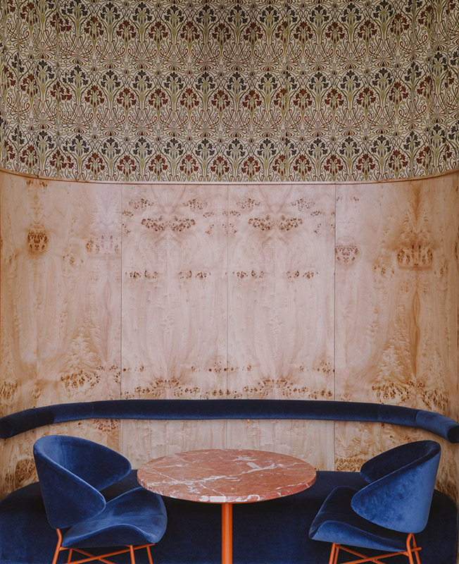 Buck.Studio предложили палитру натуральных оттенков в качестве общего знаменателя: кораллы, чирок, мед и королевский синий определяют палитру ресторана. Бархат различных оттенков виден повсюду, в первую очередь он используется для обивки рифленых стальных стен, используемых для каждой комнаты.