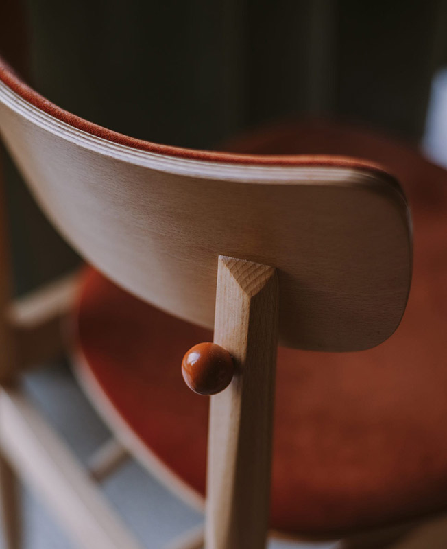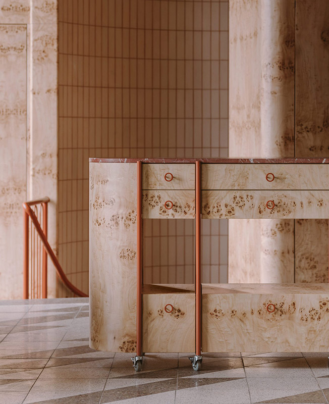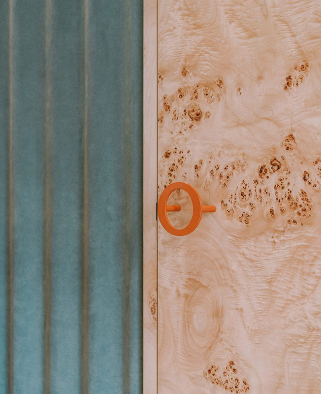Это не только создает волнистую текстуру, которая выглядит по-театральному эффектно, но также означает, что стены получают роль акустических панелей. В отличие от богатого бархата, мебель создана из шпона тополя, который выгодно контрастирует с ржаво-красным мрамором.