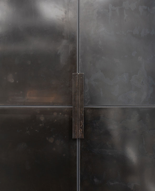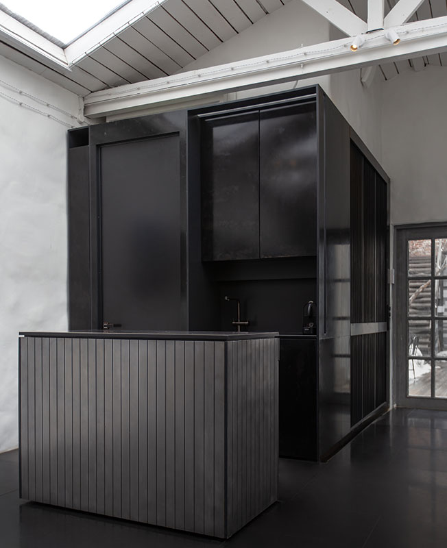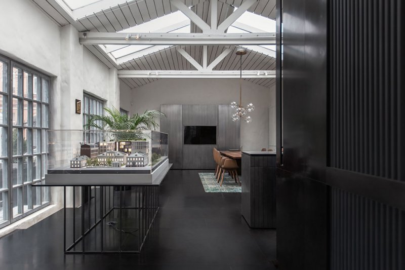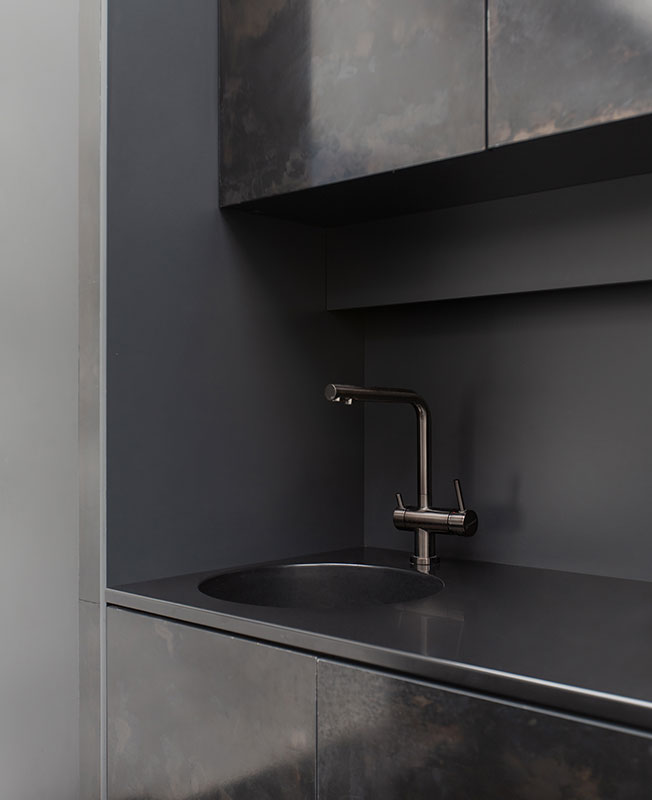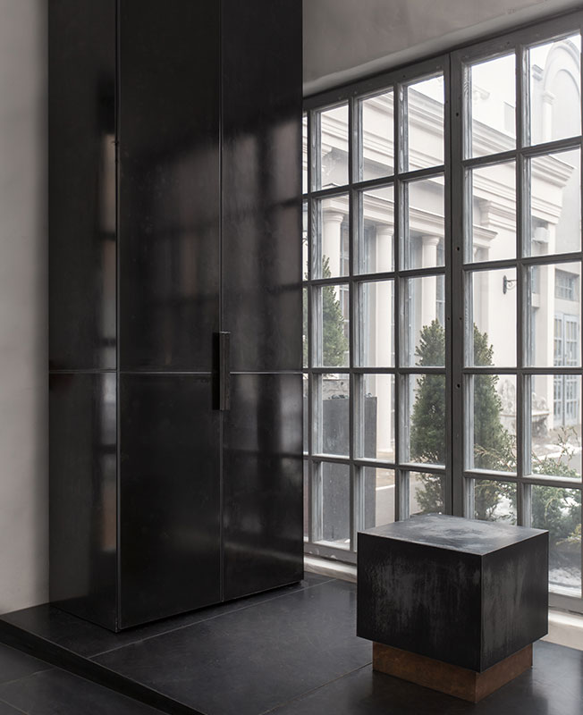 Тема контрастной архитектуры разных времен продолжается и в выбранных материалах. «Мы использовали один материал в разной обработке: листы черного металла в отделке пола, шкафов, кухни, а из полированного металла получились передвижной модуль-бар и раздвигающаяся панель для ТВ презентаций», — рассказывают авторы проекта.