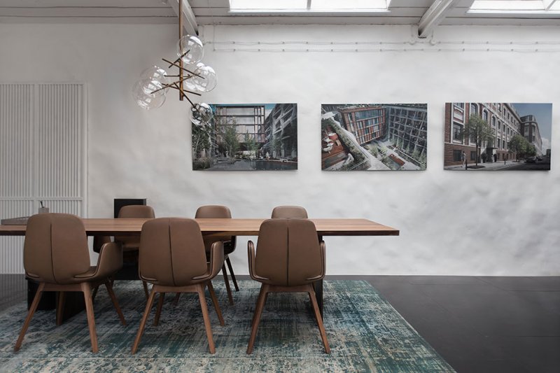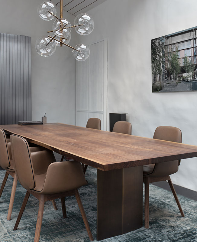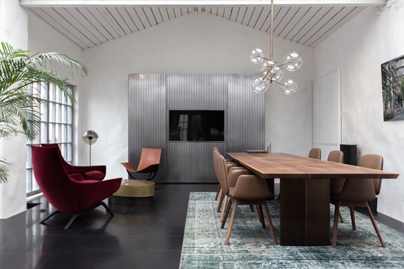 Пространство зонировали при помощи мебели. Центральная группа для встреч включает стол с массивной столешницей из американского ореха от компании Riva 1920, кожаные стулья от немецкого бренда Freifrau и потолочный светильник со стеклянными шарами Gallotti&Radice. Дополняют образ кресла MisuraEmme винного оттенка и кресла Favius со сложной архитектурной формой из металла и кожи терракотового оттенка, а также журнальный столик Baxter.