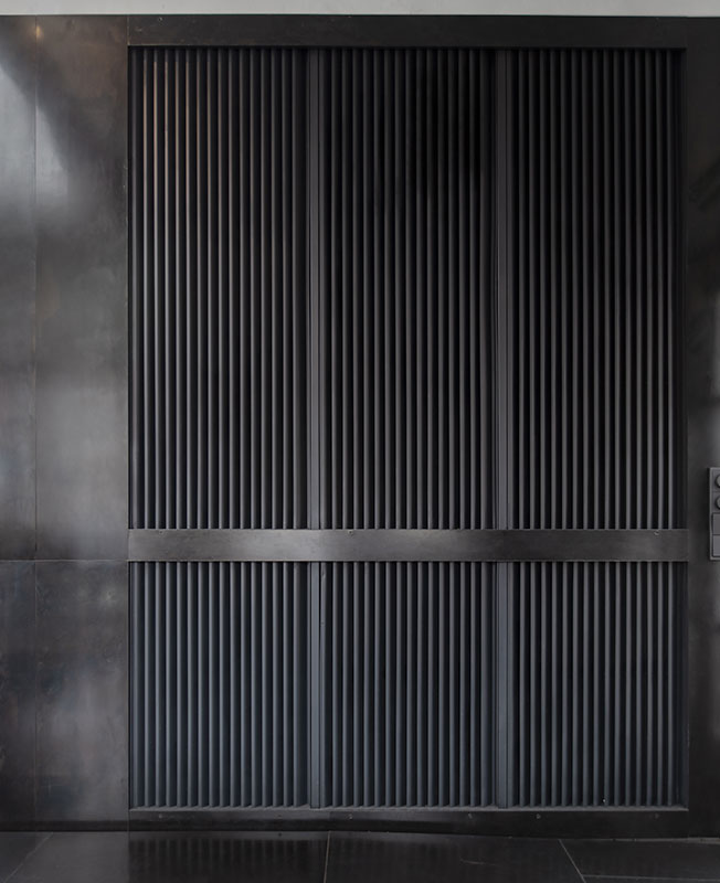 Высокотехнологичный монообъем из листового металла темного цвета деликатно вложили в пространство старинного флигеля. Такое решение позволило создать баланс между новым и старым, подчеркнув историю места и концепцию нового жилого комплекса.