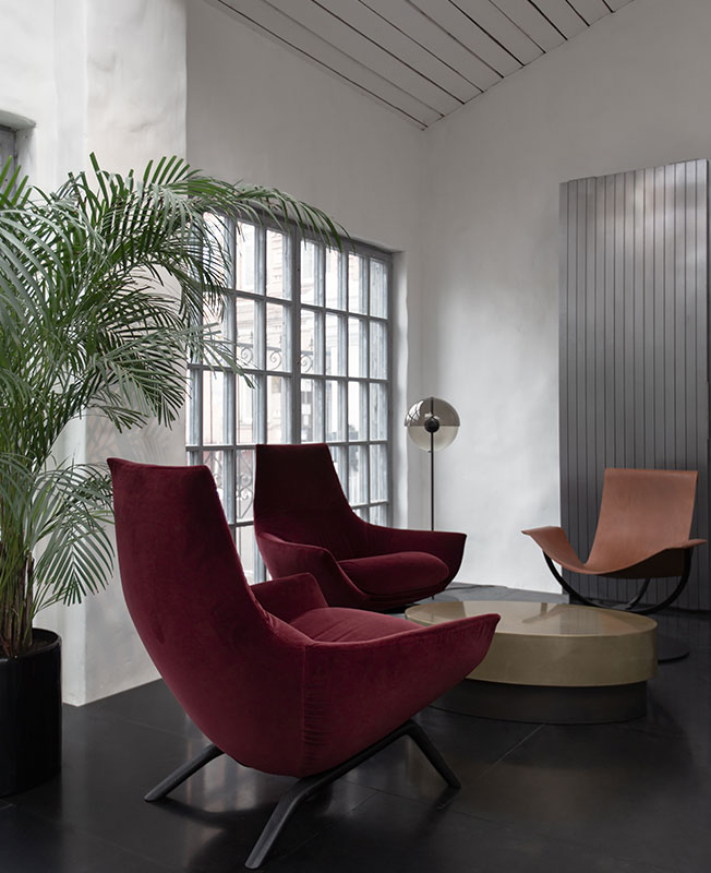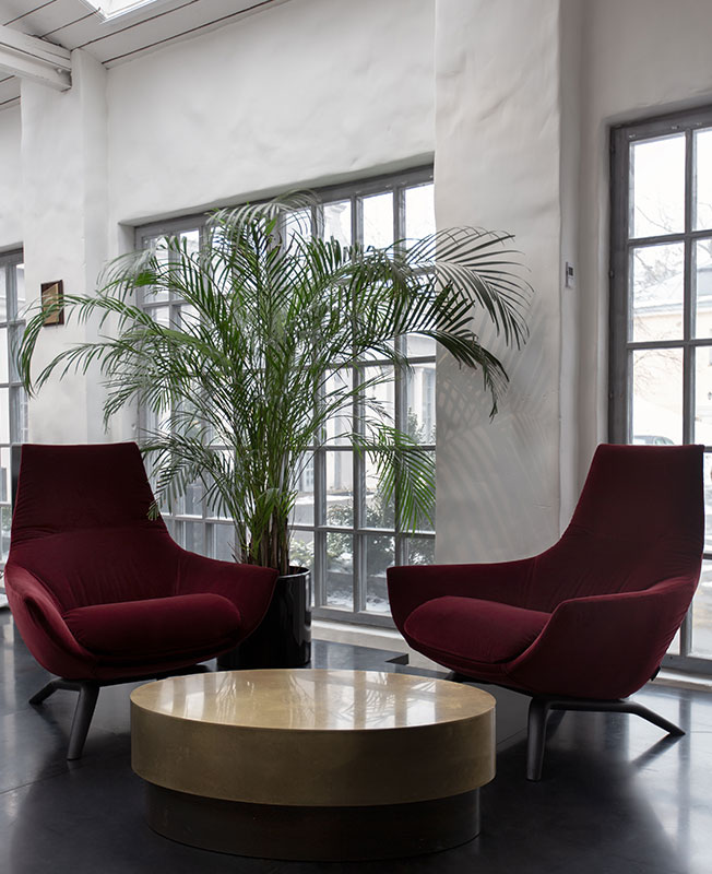 Несмотря на большое количество металла, пространство получилось уютным за счет деталей: мягкого ковра, кресла с бархатной обивкой, теплого цвета стен, зелени и мягкого освещения. Сдержанная палитра дополнена спокойными цветовыми акцентами в виде мебельных групп.