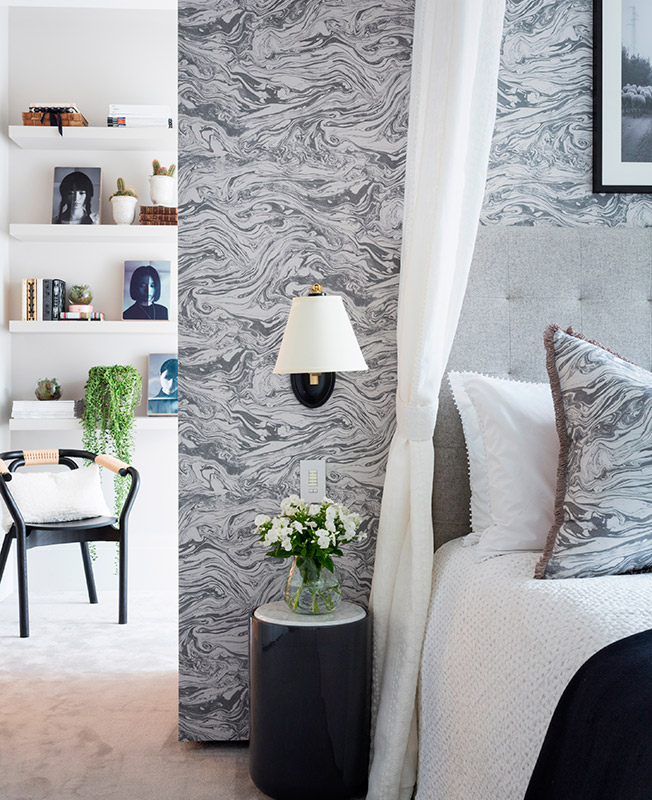 В столовой за раздвижными перегородками находится медиа-комната. Софи закрыла заднюю стену оригинальными монохромными обоями Strata Study от Appаratus.
