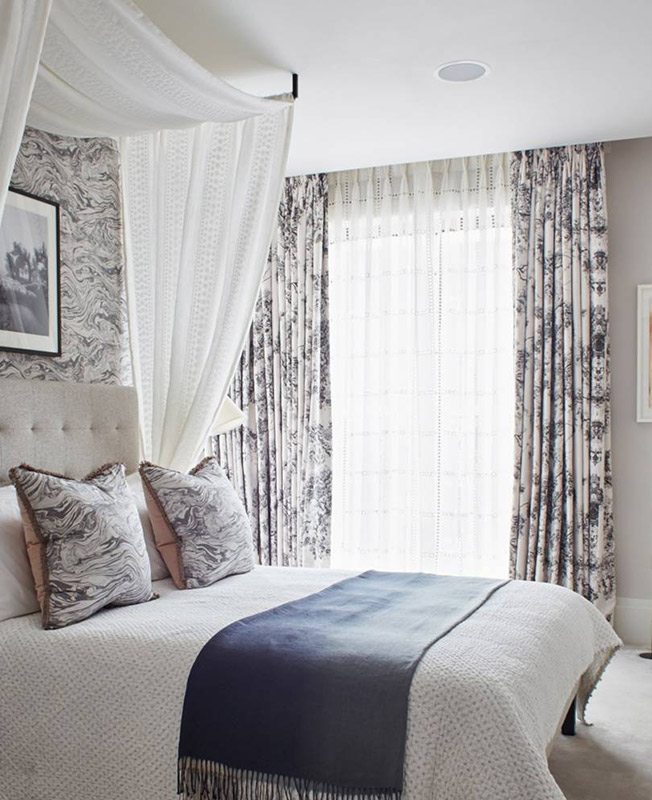 Спальня дочери представляет собой некое «пирожное» из мраморных серых обоев и тонких муслиновых штор. По соседству находится главная спальня, большое пространство со стенами, декорированными шелковыми обоями палевого оттенка.