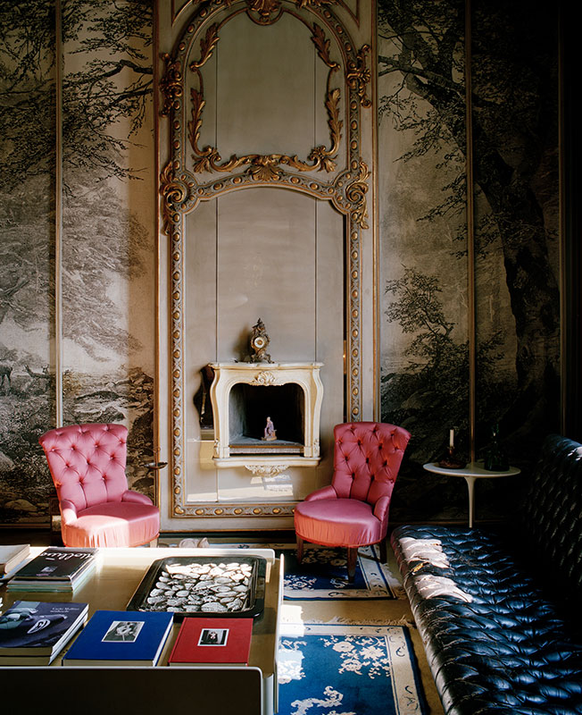 Гостиная. На стене увеличенная фотография немецкой гравюры XVIII в. Столик по дизайну В. Маджистретти, Gavina. У камина, выполненного по эскизам К. Моллино, кресла из его фамильной виллы.