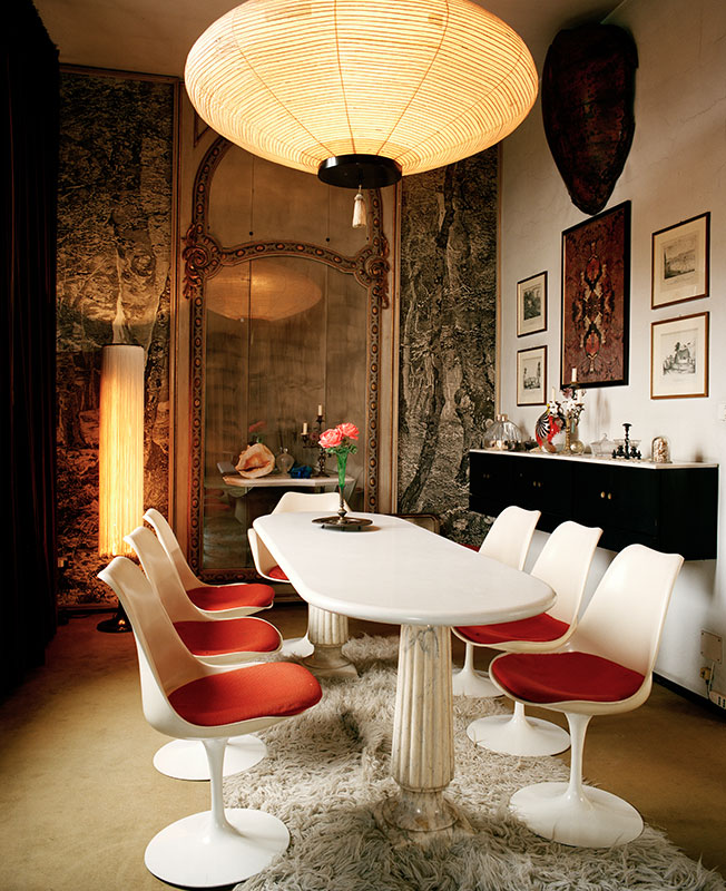 В столовой: вокруг стола, диз. К. Моллино, стулья Tulip, диз. Э. Сааринен. Наверху японский фонарь, слева торшер Дж. Фраттини.