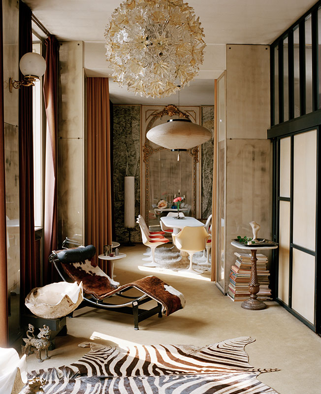 Вид из гостиной в столовую. Шезлонг LC4 в шкуре пони, диз. Ле Корбюзье, П. Жаннере и Ш. Перриан. Сегодня модель выпускает Cassina.