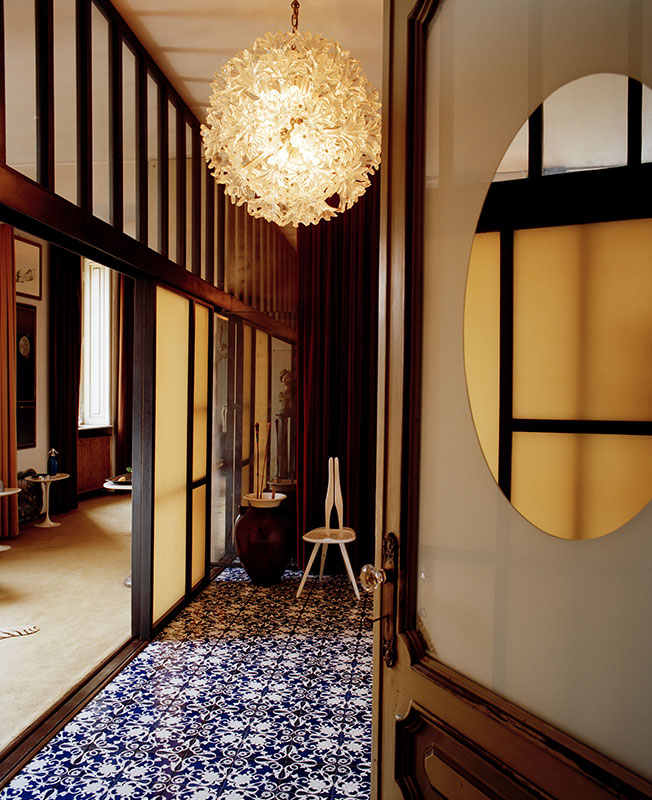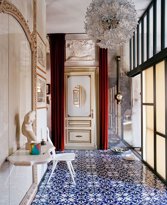 Холл. Пол выложен сине-белой орнаментальной плиткой. Стул дизайна К. Моллино.