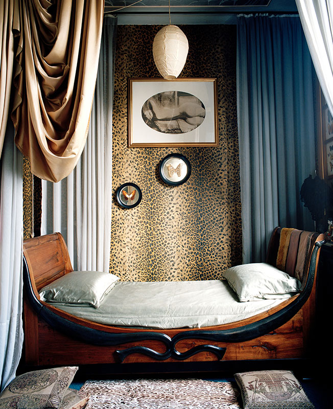 Спальня, она же «комната бабочек». Над кроватью-ладьей с египетскими мотивами два экземпляра насекомых под стеклом — всего в коллекции Моллино их несколько сотен. Здесь же одна из его фотографий.
