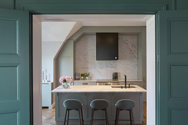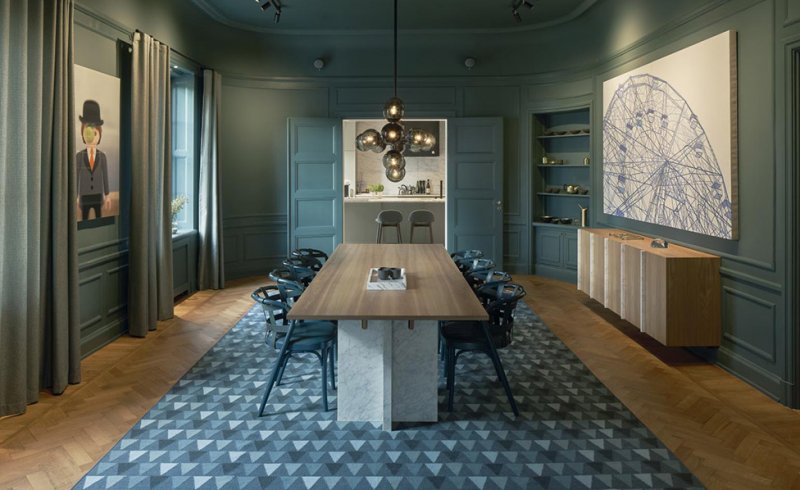 Команда Sandellsandberg Architects провела оригинальную реконструкцию квартиры в доме XVIII века в Стокгольме. Новый смелый современный интерьер наполненный искусством и дизайнерскими находками. Цель состояла в том, чтобы создать что-то необычное, объясняет команда. «Мы хотели удивлять и удивлять людей, как только они входят в дверь!» Их подход предполагает использование цвета и сделанных на заказ элементов. Потолок с активными росписями в духе традиционных скандинавских орнаментов в главном зале визуально захватывает и подчеркивает вау-эффект, на который рассчитывают архитекторы. Он также работает на то, чтобы улучшить геометрию пространства. Мебель в комнате была специально подобрана для дополнения этой геометрии. «Одной из вдохновляющих идей для нас стал сам дом, построенный шведским архитектором XVIII века Свеном Маркелиусом», — говорят они. Другие комнаты отличают богатые оттенки и изготовленные на заказ предметы мебели, такие как обеденный стол из мрамора и вяза. В гостиной есть особый шкаф с потайной барной секцией, обширной коллекцией виниловых пластинок и книг. «Все комнаты (и стены, и потолки) окрашены в монохромный цвет, поверхности различаются только благодаря использованию разного блеска. Здесь глянцевые потолки и матовые стены.»