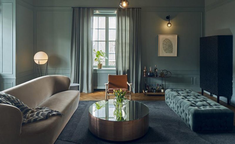 Потолок с активными росписями в духе традиционных скандинавских орнаментов в главном зале визуально захватывает и подчеркивает вау-эффект, на который рассчитывают архитекторы. Он также работает на то, чтобы улучшить геометрию пространства. Мебель в комнате была специально подобрана для дополнения этой геометрии. «Одной из вдохновляющих идей для нас стал сам дом, построенный шведским архитектором XVIII века Свеном Маркелиусом», — говорят они.