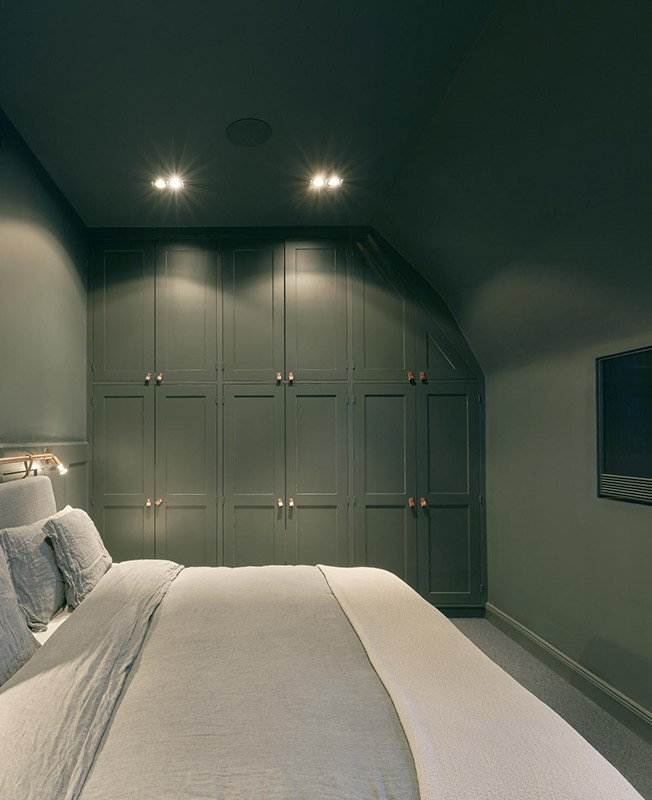 «Все комнаты (и стены, и потолки) окрашены в монохромный цвет, поверхности различаются только благодаря использованию разного блеска. Здесь глянцевые потолки и матовые стены.»