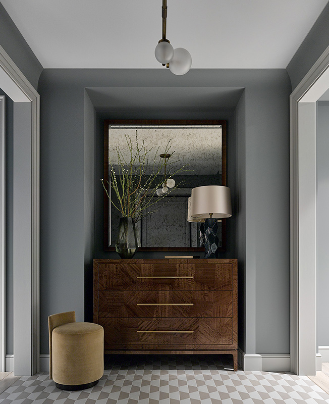 Прихожая. На полу плитка бренда Etruria, колл. Hex. Cветильники Heathfield. Пуф The Sofa & Chair. Комод изготовлен на заказ, в отделке использован шпон Graffiti и ручки от Soda Homedecor. nonehttps://www.instagram.com/https://www.facebook.com/http://www.laburo.ru/