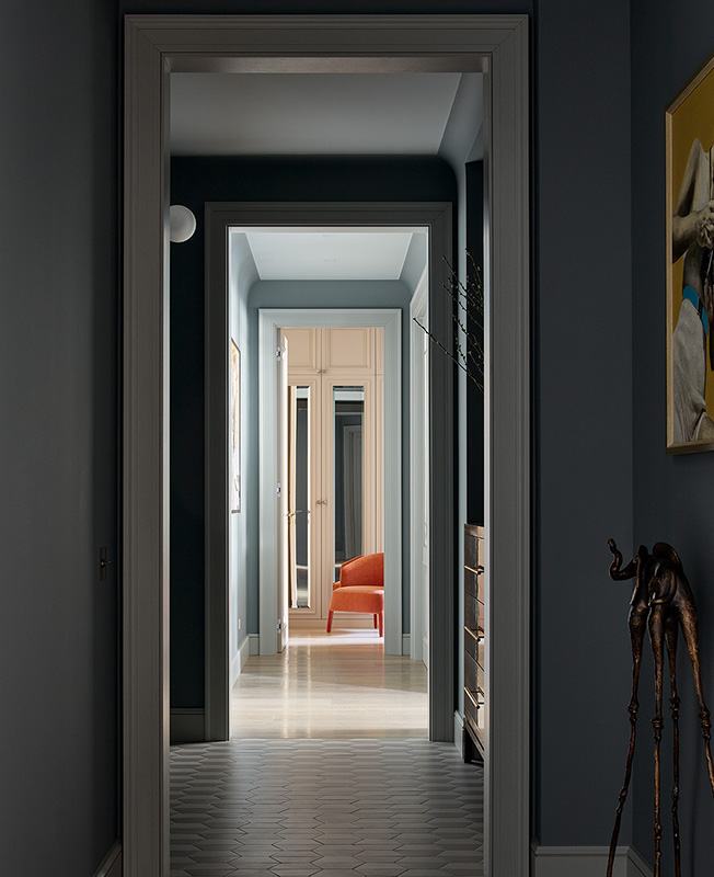 Вид из коридора на приватные апартаменты хозяев. В глубине видна женская гардеробная, которой отвели отвели почти 7 кв. метров. Из нее можно попасть в спальню (направо) и в ванную (налево). Кресло B&B Italia. Слева на стене работа Нины Петровой.