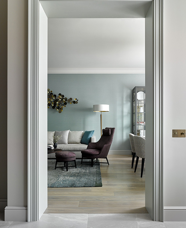 Квартиры объединяет общий парадный холл, откуда симметрично расходятся коридоры: слева расположена парадная часть, включающая объединенную гостиную-столовую, а также хозяйская спальня с гардеробной и ванной. Справа — детские комнаты и гардеробные. Детские делали на вырост: нейтральные стены, «взрослая» мебель.