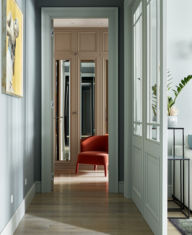 Вид из прихожей в приватную половину. В глубине видна гардеробная хозяйки, этому помещению отвели почти 7 кв. метров. Из нее можно попасть в спальню (направо) и в ванную (налево). Кресло B&B Italia.
