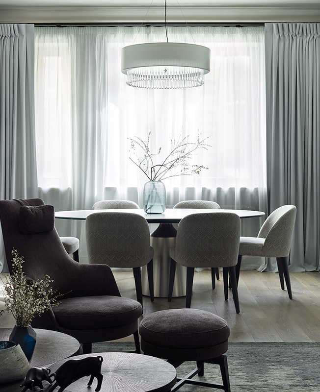 Стол Cattelan Italia расположили у окна, вокруг него стулья Meridiani. Люстра Heathfield. Шторы из легкой шерсти Mark Alexander лежат красивыми драпировками. Текстильное оформление: мастерская Volokno.