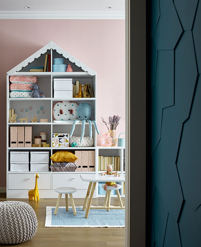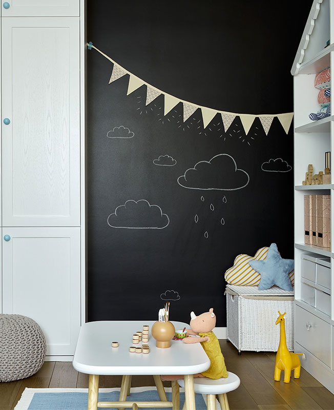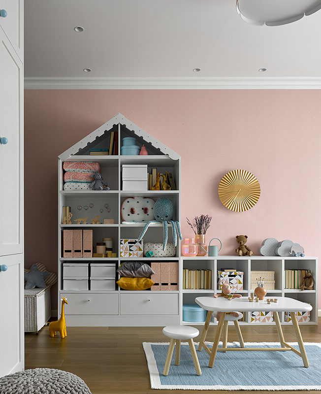 Детская. Часы Novia, салон «Урбаника». Стеллаж выполнен на заказ по эскизам дизайнеров. Столик, стул, ковер, пуф, игрушки, Zara Home; H&M Home. Потолочный светильник, встроенный свет, Delta light.