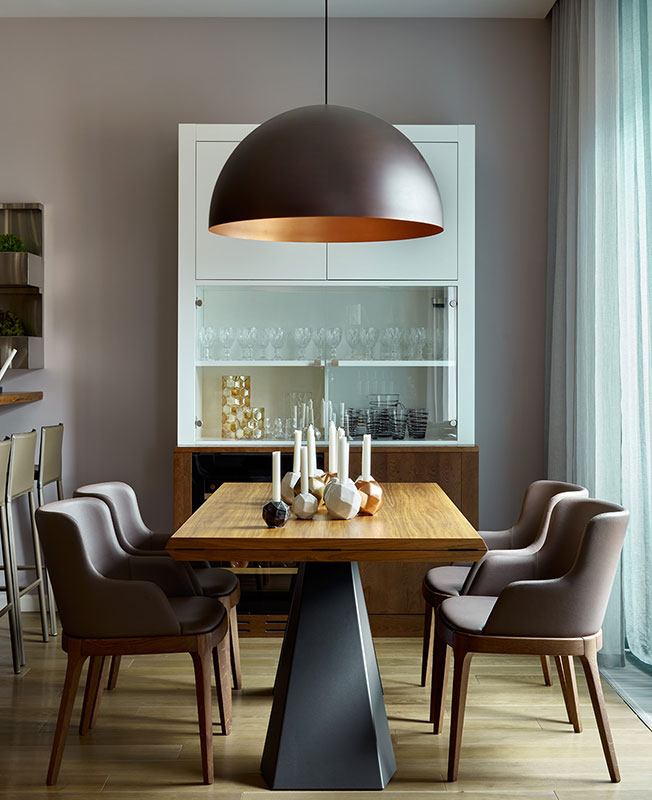 Обеденный стулья, стол, Cattelan Italia. Шкаф для посуды выполнен на заказ по эскизам дизайнеров. Подвесной светильник, Fabbian. Шторы, Zimmer + Rohde.