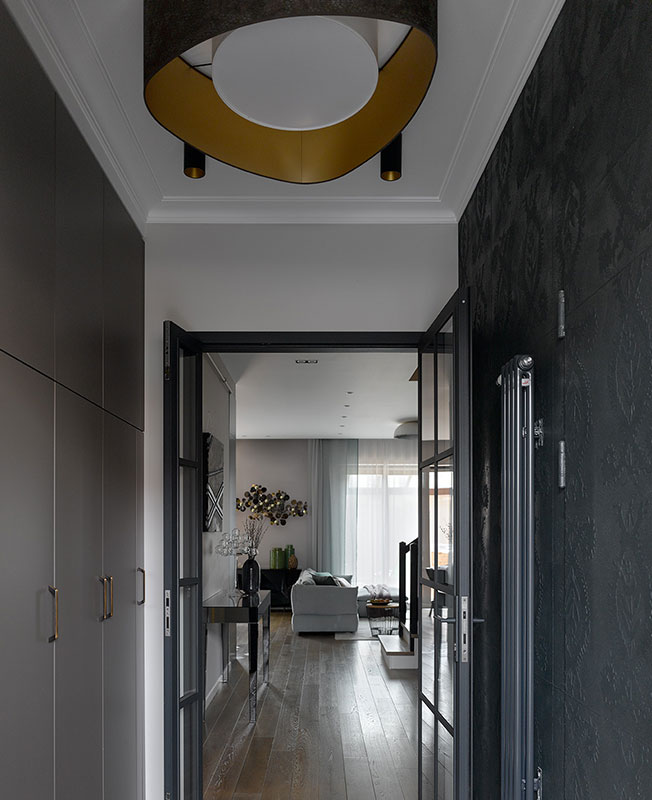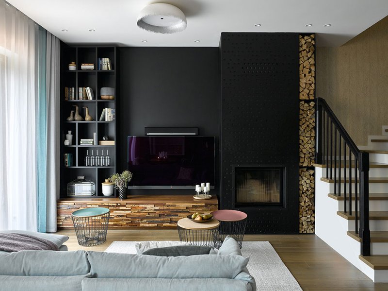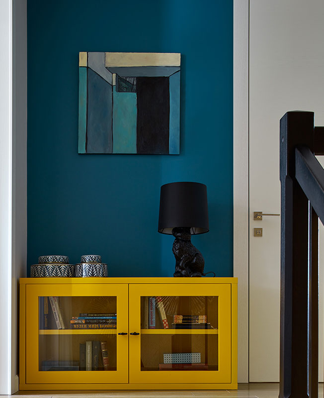 «Мы использовали сложные цвета — пыльные, яркие. Были весьма удивлены, что заказчики приняли наше решение с черной стеной в гостиной – весьма смелый шаг», — рассказывают о проекте дизайнеры.
