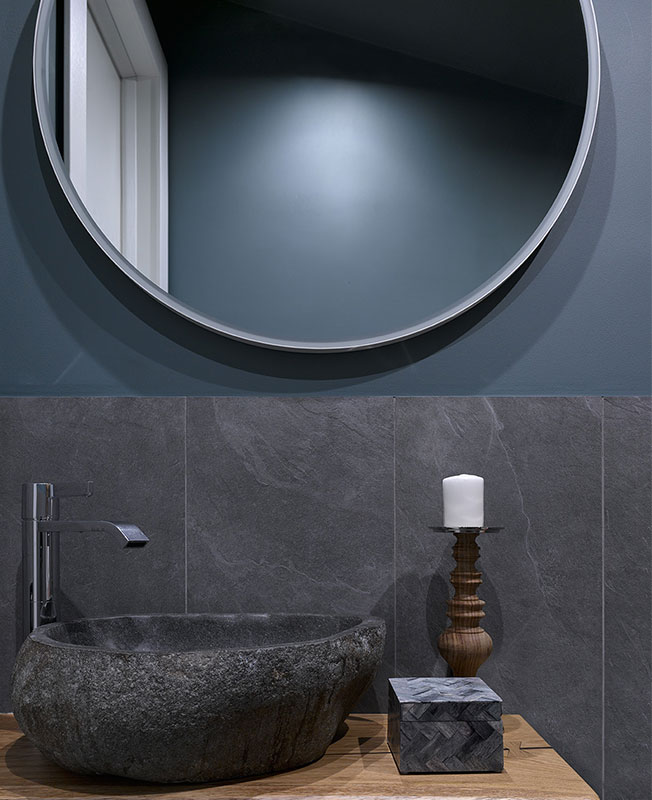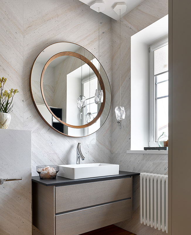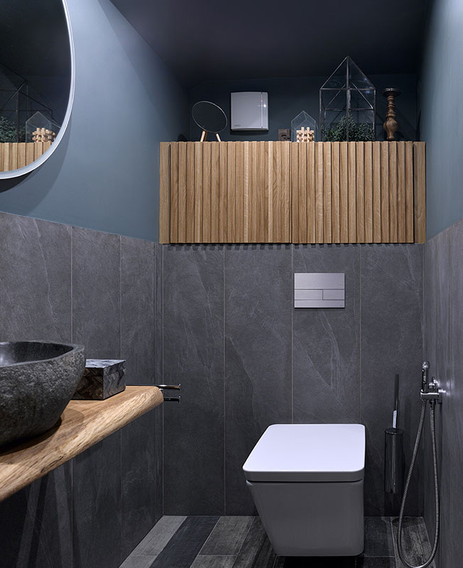 Гостевой санузел на первом этаже. Каменная раковина, Teak House. Столешница выполнена на заказ из массива дуба.