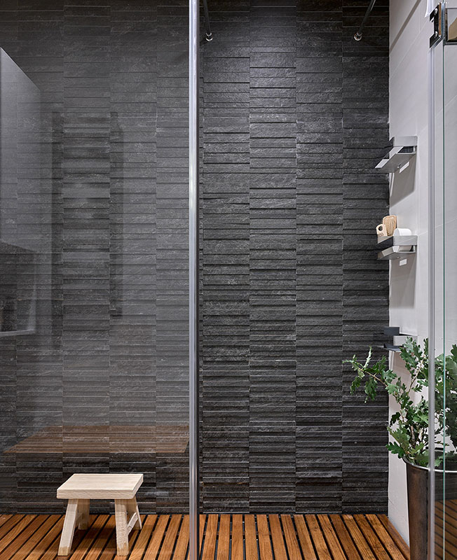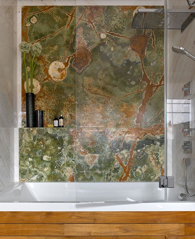 В интерьере дизайнеры сочетали разные необычные фактуры — обои с имитацией пальмовых листьев на лестнице, рельефные гипсовые панели в холле второго этажа, натуральный камень и древесину в отделке ванных комнат, декоративную штукатурку в холле первого этажа и др.