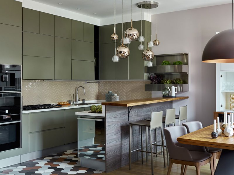 Кухня. Гарнитур выполнен на заказ по эскизам дизайнеров. Плитка, Etruria Design. Плитка на фартуке, Mutina. Барные стулья, Cattelan Italia. Светильники, Penta. Кашпо выполнено на заказ, мастерская Алексея Даньшина.