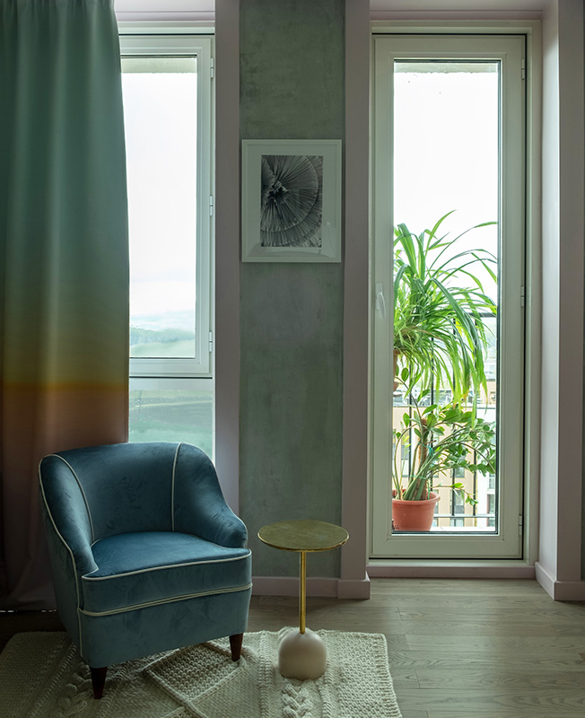 Панорамные окна создают в квартире приятную атмосферу. «Здесь много света и неба, роскошнейшие закаты», — говорит автор проекта. Итальянское кресло 1950-х обтянуто голубым бархатом (Galor Gallery). Рядом столик дизайна Павла Воловова. Черно-белое фото — также его работа.